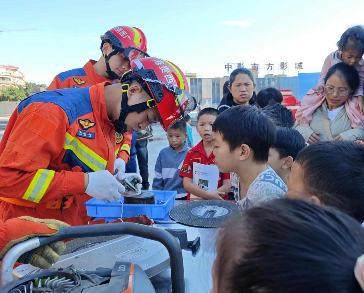 消防员向现场群众科普消防器材的原理与使用方法,通俗易懂的讲解吸引大家的目光。方天学 摄