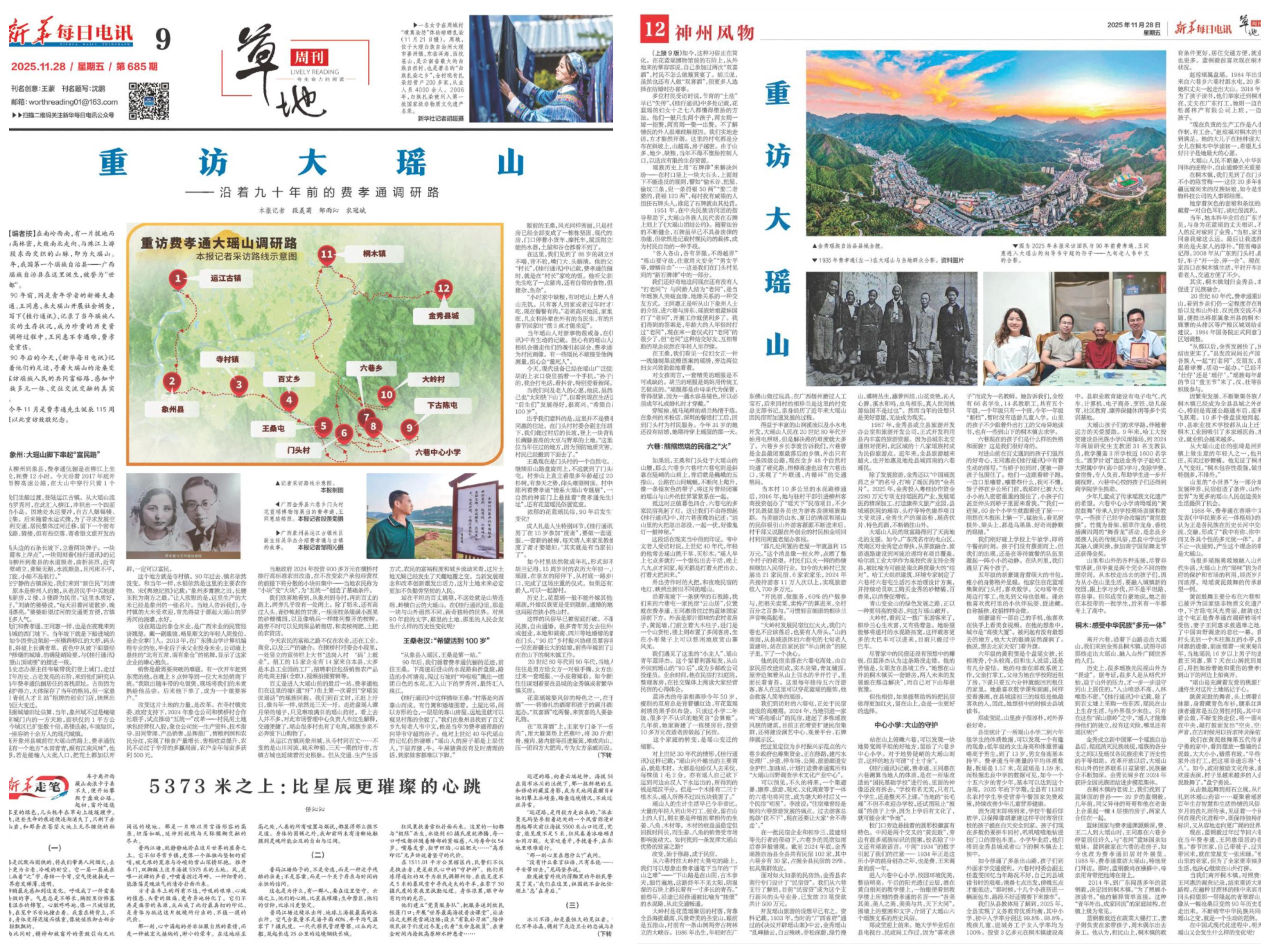 本文涉及的象州县百丈乡是费孝通、王同惠进入大瑶山前的最后一站,今年象州县在这里推出了费孝通当年在象州的有关展览。乡党委副书记、乡长闭利武说,《新华每日电讯》的重访报道,让人感受到新闻宣传“记录时代”的力量。“90年风雨兼程,90年薪火相传。”他期待弘扬“从实求知”的调研精神,深耕基层、扎根人民,“用新闻的力量讲好瑶山振兴的时代答卷”。