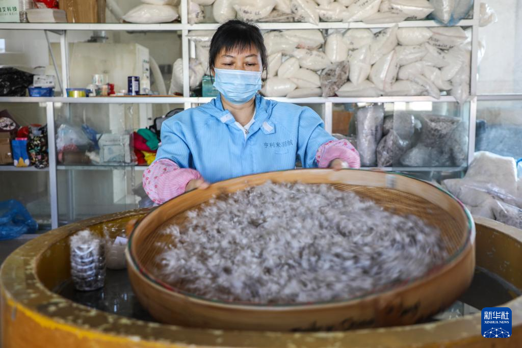 在广西贵港市港南区桥圩镇一家羽绒制品生产企业,工作人员检查收购的原料毛品质(12月18日摄)。