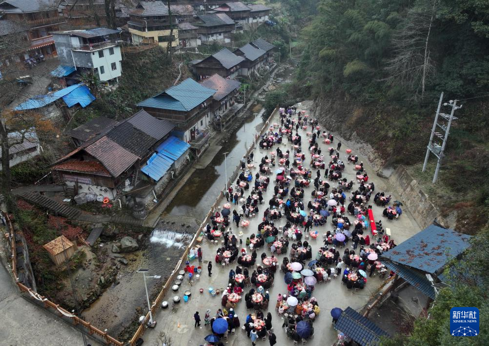 1月20日,苗族群众和游客同享百家宴(无人机照片)。