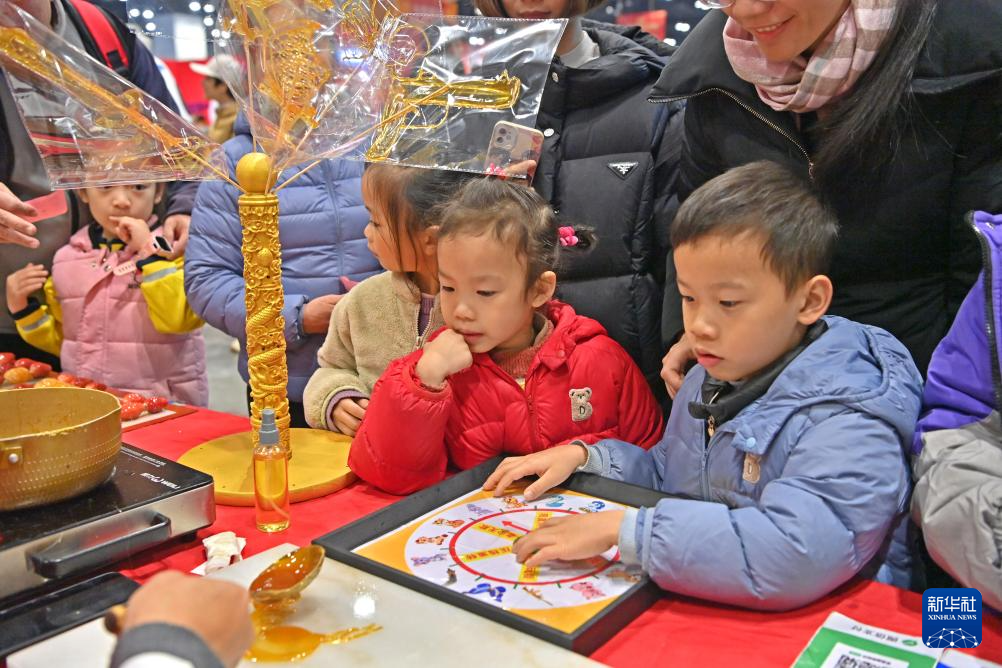 1月24日,在广西南宁国际会展中心,小朋友在年货大集上观看糖画。