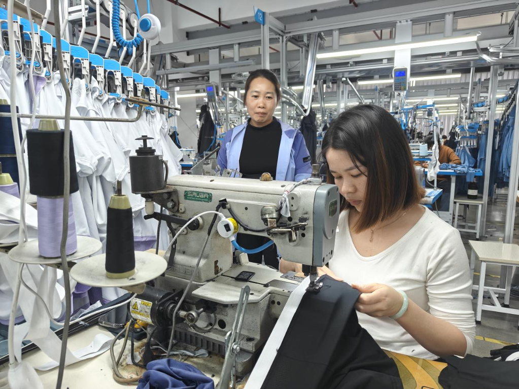 在广西中健运动休闲服饰有限公司的生产车间,上千名工人正在流水线上紧张有序地作业。